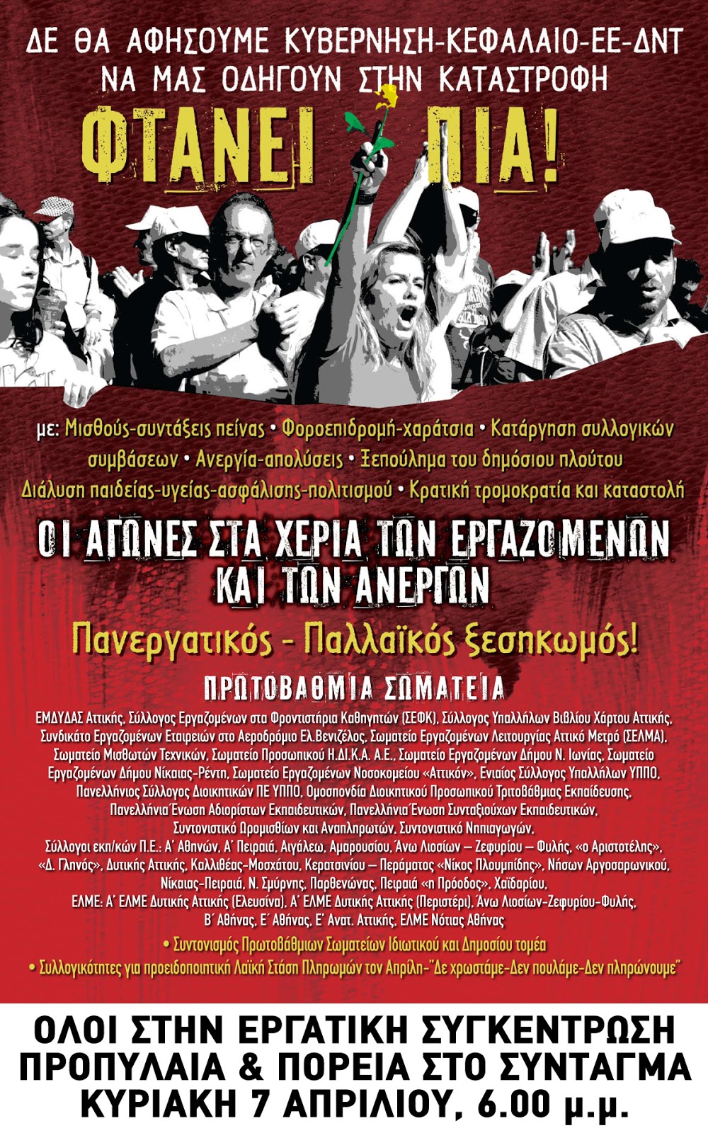 Η Αυτόνομη Παρέμβαση καλεί την εργατική τάξη και όλους τους εργαζόμενους να δώσουν ξανά το αγωνιστικό τους παρόν στο παλλαϊκό συλλαλητήριο στο Σύνταγμα, την Κυριακή 7 Απρίλη στις 6,30μμ (προσυγκέντρωση 6 μ.μ στα προπύλαια).