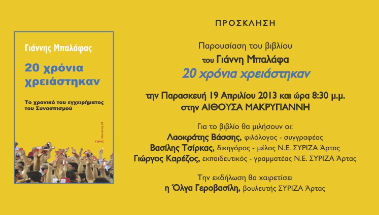 Το βιβλίο του Γιάννη Μπαλάφα, που κυκλοφόρησε πρόσφατα από τις εκδόσεις «Νήσος», παρακολουθεί την εικοσάχρονη πορεία του Συνασπισμού, από το 1992 μέχρι το 2012. Μια πορεία που σημαδεύτηκε από πολλές δοκιμασίες, συγκρούσεις και αμφισβητήσεις. Μια πορεία που πέρασε από τη συγκρότηση της συμμαχίας του ΣΥΡΙΖΑ, για να φτάσει στον ΣΥΡΙΖΑ-ΕΚΜ και στη σημερινή του ανάδειξη σε πρωταγωνιστή της πολιτικής ζωής του τόπου. Με μόνιμο το ενδιαφέρον για τα κοινωνικά δρώμενα, με σταθερό στόχο να σπάσει ο φαύλος κύκλος της δικομματικής εναλλαγής, με όραμα πάντα τη δημοκρατική-σοσιαλιστική αναγέννηση, το σοσιαλισμό με δημοκρατία και ελευθερία στην Ελλάδα και τον κόσμο ολόκληρο.
