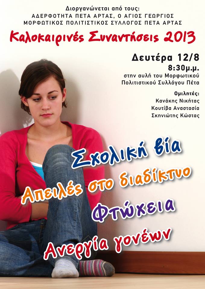 Τη Δευτέρα 12 Αυγούστου το βράδυ έγινε στο Πέτα εκδήλωση – συζήτηση με θέμα «Κίνδυνοι για τα παιδιά σήμερα. Διαδίκτυο, σχολική βία και κοινωνικός αποκλεισμός».