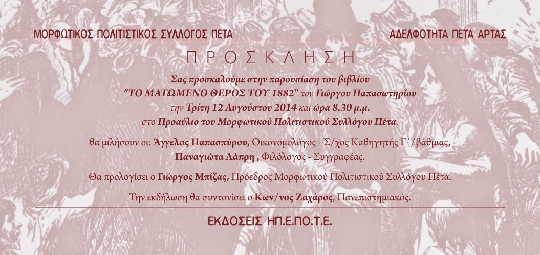 Την παρουσίαση του βιβλίου «Το ματωμένο θέρος του 1882» στο Πέτα, την Τρίτη 12/8 και ώ