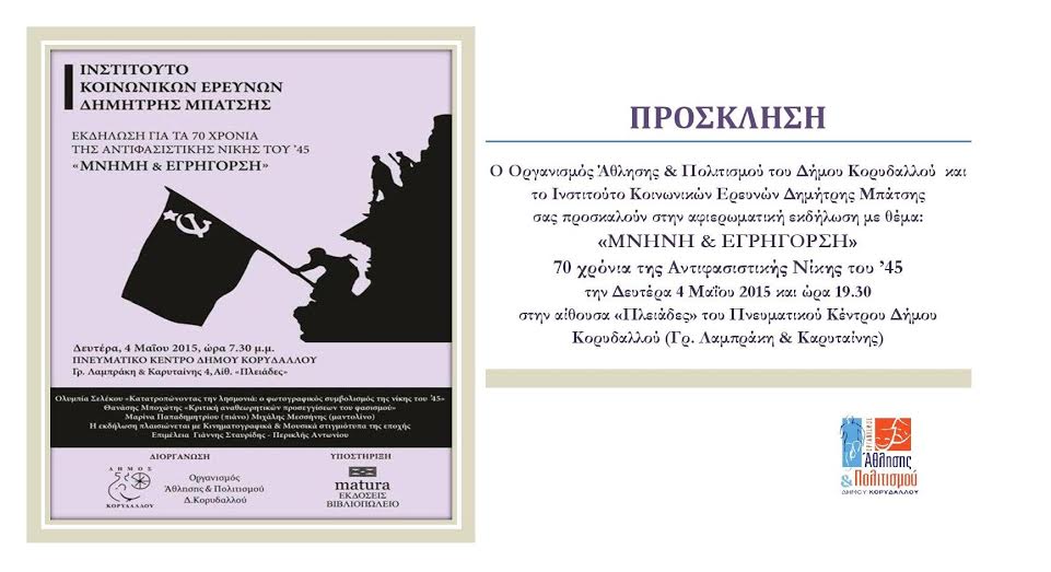 στην εκδήλωση που συνδιοργάνωνε ο Οργανισμός Άθλησης και Πολιτισμού του Δήμου Κορυδαλλού και το Ινστιτούτο Κοινωνικών Ερευνών «Δημήτρης Μπάτσης» την Δευτέρα 4 Μαίου 2015, με αφορμή την συμπλήρωση 70 χρόνων από την αντιφασιστική νίκη του 1945.
