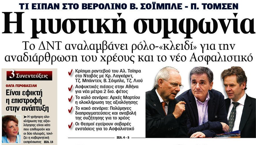 Αυτή τη στιγμή έχει διαμορφωθεί ένα καλό κλίμα με τους θεσμούς. Ταυτόχρονα, τόσο η αποδοχή της ανάγκης όσο και οι συνθήκες για τη συζήτηση για το χρέος έχουν ωριμάσει. Επιπλέον, η γρήγορη ολοκλήρωση της αξιολόγησης είναι κάτι που επιθυμούν όλες οι πλευρές. Πιστεύω λοιπόν, πως είναι ρεαλιστικό να υπολογίζουμε ότι το Φλεβάρη θα ολοκληρωθεί με επιτυχία η αξιολόγηση, κάτι που θα οδηγήσει στο επόμενο βήμα. Δηλαδή να τοποθετηθεί στο τραπέζι το ζήτημα της ελάφρυνσης του ελληνικού χρέους, ώστε να καταστεί βιώσιμο.