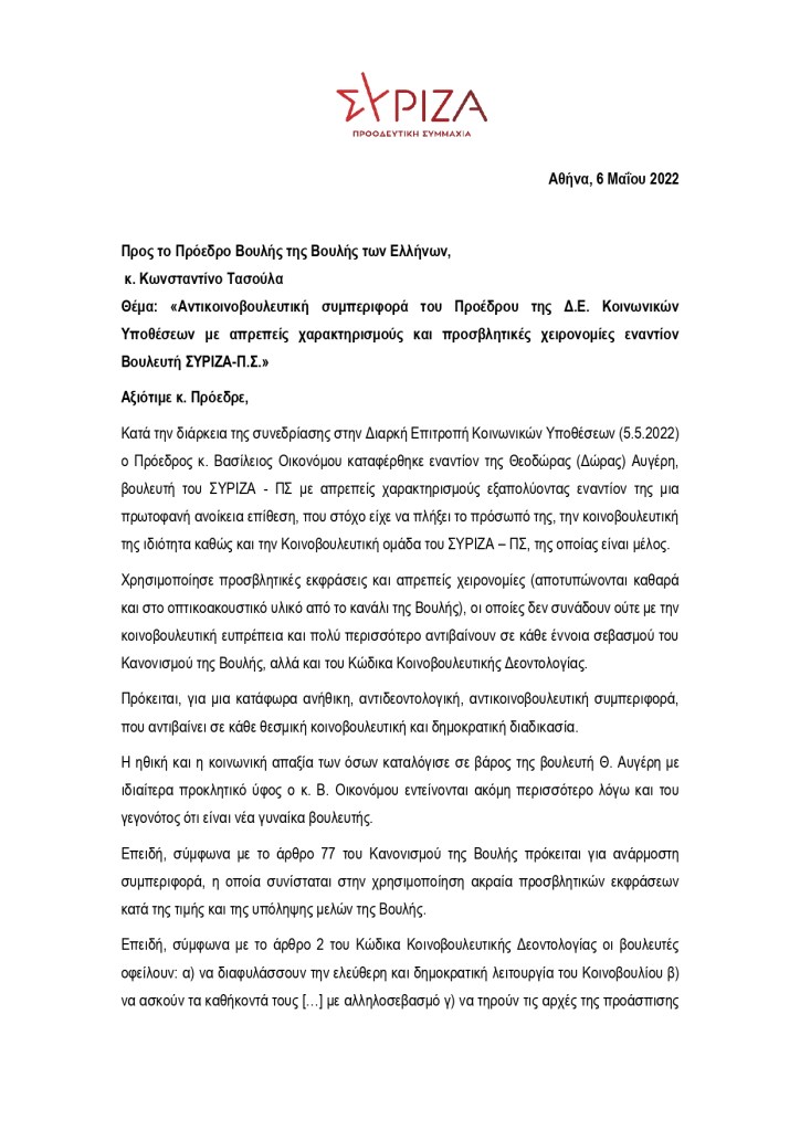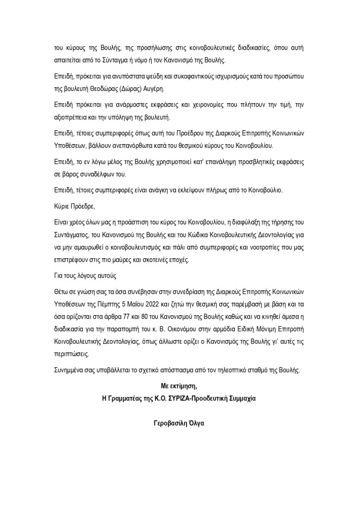 Σε κατάθεση καταγγελίας προς τον Πρόεδρο της Βουλής κ. Κωνσταντίνο Τασούλα με θέμα «Αντικοινοβουλευτική συμπεριφορά του Προέδρου της Δ.Ε. Κοινωνικών Υποθέσεων με απρεπείς χαρακτηρισμούς και προσβλητικές χειρονομίες εναντίον Βουλευτή ΣΥΡΙΖΑ-Π.Σ.» προέβη σήμερα 6.5.2022 η Γραμματέας της Κ.Ο. του ΣΥΡΙΖΑ-ΠΣ Όλγα Γεροβασίλη, σε συνέχεια της ανοίκειας και προκλητικής επίθεσης, που αντιβαίνει σε κάθε έννοια σεβασμού του Κανονισμού της Βουλής, αλλά και του Κώδικα Κοινοβουλευτικής Δεοντολογίας, του Β. Οικονόμου προς την βουλευτή του ΣΥΡΙΖΑ-ΠΣ Δ. Αυγέρη κατά τη σύγκλιση της Δ.Ε. στις 5.5.22.