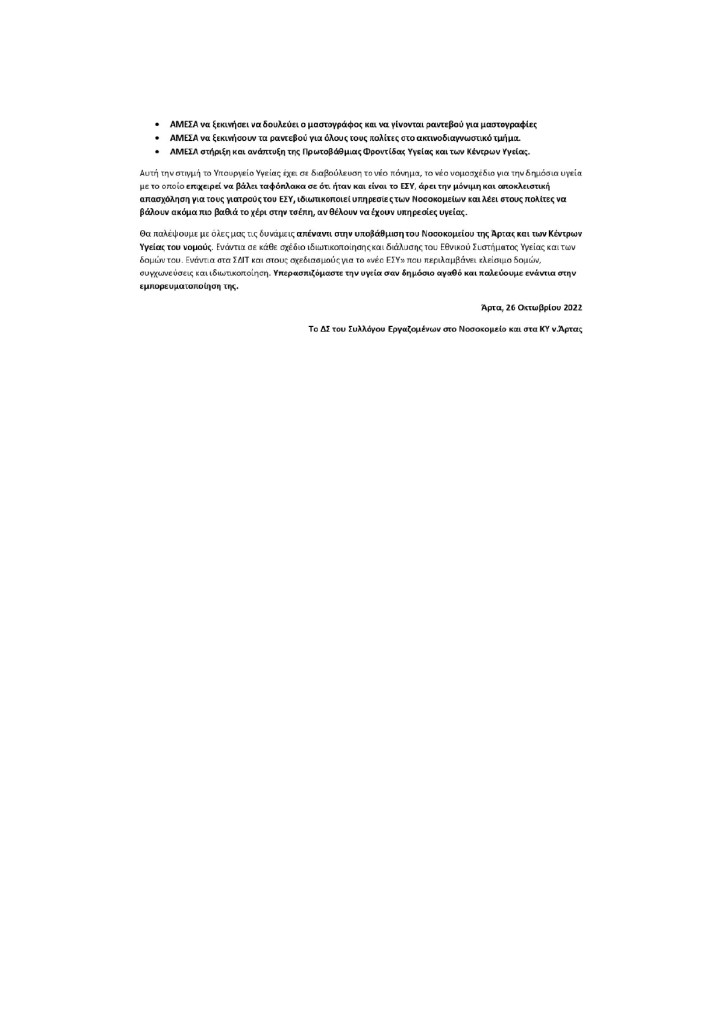 Περαιτέρω, ο Σύλλογος Εργαζομένων ζητά: «άμεσα να καλυφθούν τα οργανικά κενά στο ακτινοδιαγνωστικό τμήμα, να καλυφθούν οι ανάγκες και να σταματήσει η εργασιακή εξόντωση των συναδέλφων, άμεσα μαζικές προσλήψεις μόνιμου προσωπικού, να ξεκινήσει να δουλεύει ο μαστογράφος και να γίνονται ραντεβού για μαστογραφίες και για όλους τους πολίτες στο ακτινοδιαγνωστικό τμήμα, άμεσα στήριξη και ανάπτυξη της Πρωτοβάθμιας Φροντίδας Υγείας και των Κέντρων Υγείας».