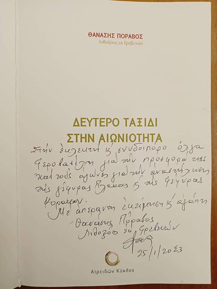 Δυστυχώς, μια ίωση με κρατά μακριά σας και δεν μπορώ να παρευρίσκομαι στη σπουδαία εκδήλωση σήμερα: την παρουσίαση του βιβλίου που έγραψε ο Θανάσης Πόραβος, «Δεύτερο Ταξίδι στην Αιωνιότητα».