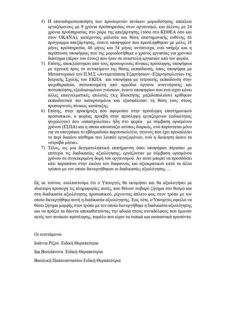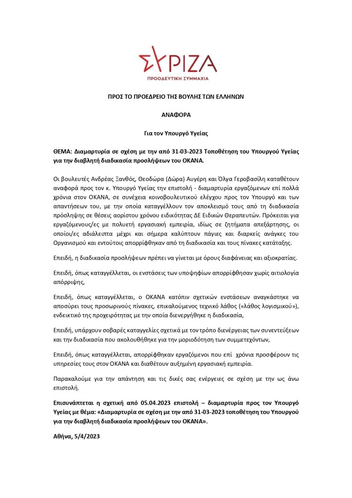 Αναφορά προς το προεδρείο της Βουλής για τον Υπουργό Υγείας με θέμα: «Διαμαρτυρία σε σχέση με την από 31-03-2023 τοποθέτηση του Υπουργού Υγείας για την διαβλητή διαδικασία προσλήψεων του ΟΚΑΝΑ» κατέθεσαν σήμερα οι Ανδρέας Ξανθός- Τομεάρχης Υγείας, βουλευτής Ρεθύμνου, Δώρα Αυγέρη- Αναπληρώτρια Τομεάρχης Υγείας, βουλευτής Β’ Θεσσαλονίκης και η Όλγα Γεροβασίλη, Γραμματέας Κ.Ο. ΣΥΡΙΖΑ-ΠΣ, βουλευτής Άρτας με την επιστολή – διαμαρτυρία εργαζόμενων επί πολλά χρόνια στον συγκεκριμένο οργανισμό, σε συνέχεια κοινοβουλευτικού ελέγχου προς τον Υπουργό Υγείας και των απαντήσεων του, με την οποία καταγγέλλουν τον αποκλεισμό τους από τη διαδικασία πρόσληψης σε θέσεις αορίστου χρόνου ειδικότητας ΔΕ Ειδικών Θεραπευτών.