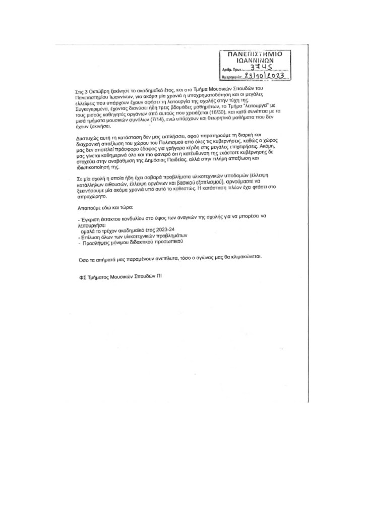 Επισυνάπτεται η κατατεθείσα αναφορά, η υπ’ αριθ. 3745/23.10.2023 Επιστολή και το από 16.11.2023 Δελτίο Τύπου του ΔΣ και ΣΦ Τμήματος Μουσικών Σπουδών Πανεπιστημίου Ιωαννίνων με έδρα την Άρτα.