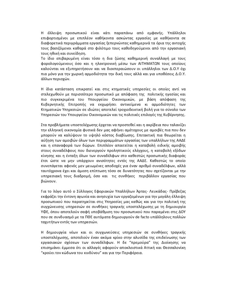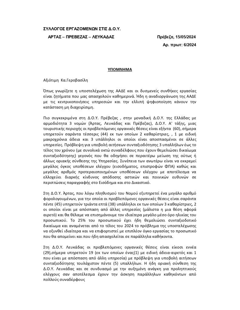 Επισυνάπτεται το κείμενο της αναφοράς και το υπ’ αριθμ. 6/2024 και από 15.05.2024 Υπόμνημα του Συλλόγου Εργαζομένων στις Δ.Ο.Υ. Άρτας – Πρέβεζας – Λευκάδας.