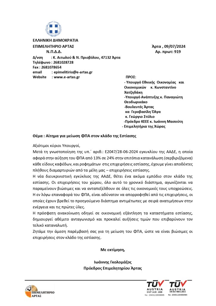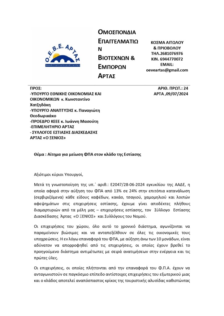 Επισυνάπτεται η υπ’ αριθμ. 919/09.07.2024 Επιστολή του Επιμελητηρίου Άρτας, η υπ’ αριθμ. 24/09.07.2024 Επιστολή της Ομοσπονδίας Επαγγελματιών Βιοτεχνών και Εμπόρων Άρτας και το κείμενο της αναφοράς που κατατέθηκε.