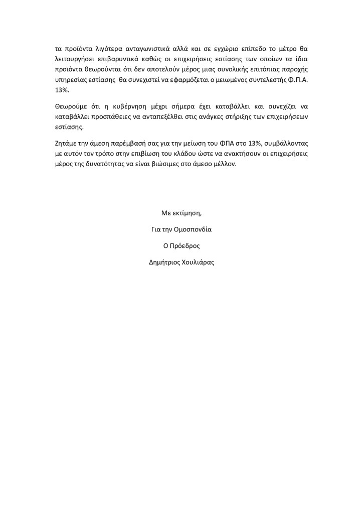Με τις επιστολές αυτές τίθεται επιτακτικά το αίτημα για μείωση του ΦΠΑ κατόπιν της άδικης αύξησής του από 13% σε 24% στην επιτόπια κατανάλωση (σερβιριζόμενα) κάθε είδους καφέδων, και ροφημάτων στις επιχειρήσεις εστίασης, μια αύξηση που είναι αδύνατον να απορροφηθεί από τις επιχειρήσεις, οι οποίες έχουν βρεθεί το προηγούμενο διάστημα αντιμέτωπες με σειρά ανατιμήσεων στην ενέργεια και τις πρώτες ύλες.