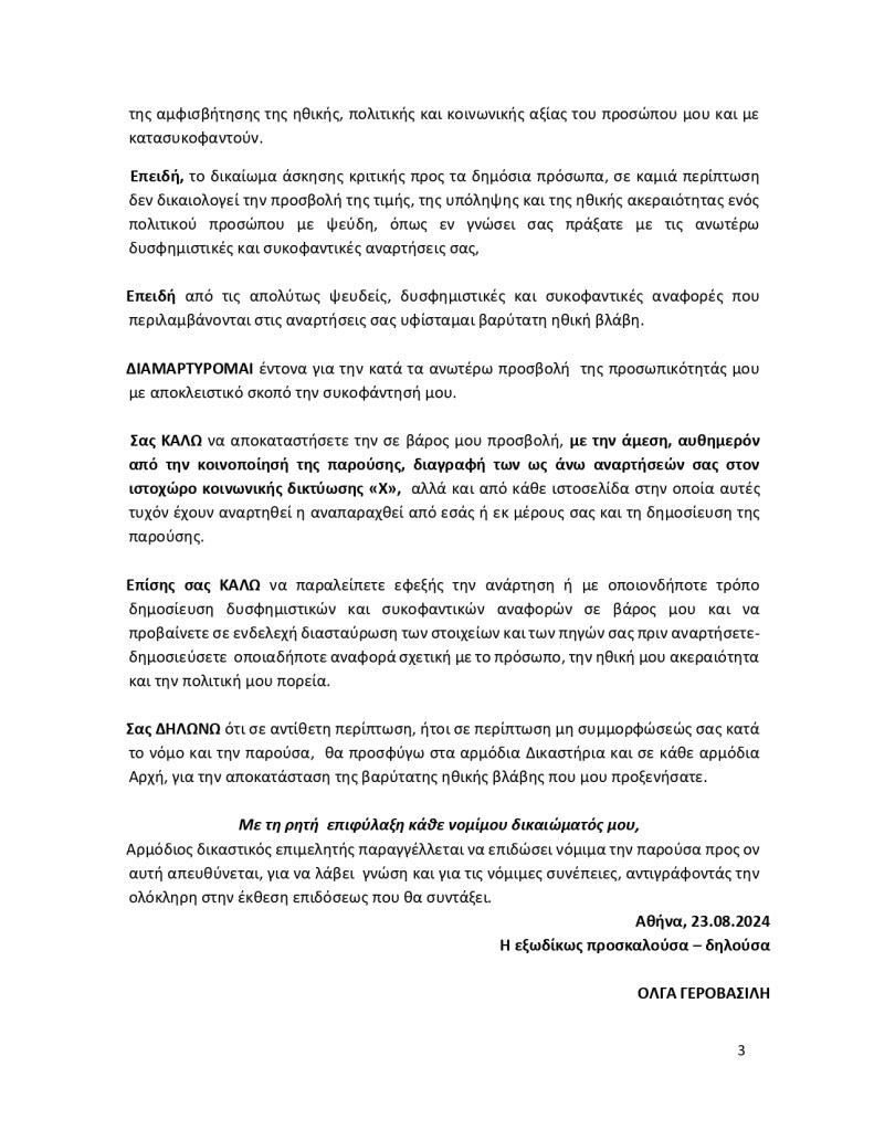 Εξώδικο απέστειλε η Όλγα Γεροβασίλη, Δ’ Αντιπρόεδρος της ΒτΕ και Βουλευτής Άρτας του ΣΥΡΙΖΑ – Προοδευτική Συμμαχία στον στιχουργό Νίκο Μωραΐτη, με το οποίο τον καλεί να ανακαλέσει τις δυσφημιστικές σε βάρος της αναρτήσεις του στο «Χ».