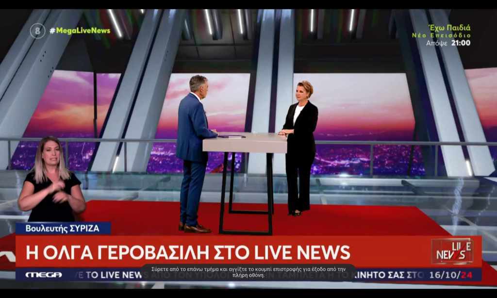 Στον τηλεοπτικό σταθμό MEGA και την εκπομπή “Live News” με τον δημοσιογράφο, Νίκο Ευαγγελάτο μίλησε νωρίτερα σήμερα το απόγευμα η Δ’ Αντιπρόεδρος της ΒτΕ και βουλευτής Άρτας του ΣΥΡΙΖΑ – Προοδευτική Συμμαχία, Όλγα Γεροβασίλη.
