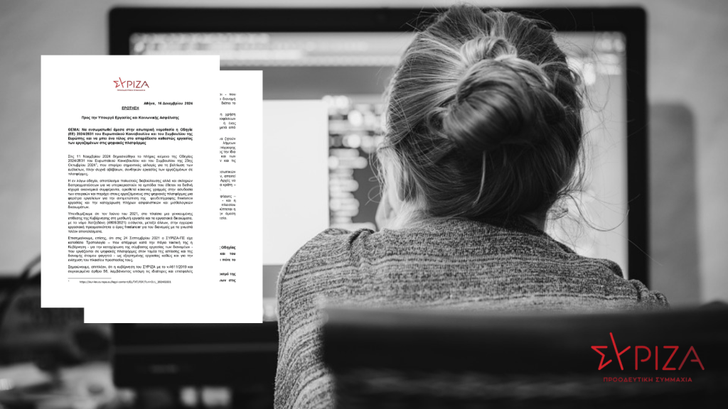 Ερώτηση προς την Υπουργό Εργασίας και Κοινωνικής Ασφάλισης με θέμα “Να ενσωματωθεί άμεσα στην εσωτερική νομοθεσία η Οδηγία (ΕΕ) 2024/2831 του Ευρωπαϊκού Κοινοβουλίου και του Συμβουλίου της Ευρώπης και να μπει ένα τέλος στο απαράδεκτο καθεστώς εργασίας των εργαζομένων στις ψηφιακές πλατφόρμες” κατέθεσαν βουλευτές του ΣΥΡΙΖΑ-ΠΣ, μεταξύ των οποίων και η βουλευτής Άρτας Όλγα Γεροβασίλη.