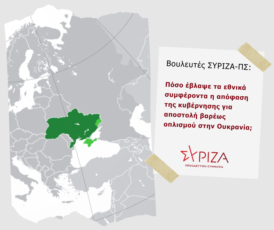 Τα σοβαρά ζητήματα που βλάπτουν τα εθνικά συμφέροντα της χώρας μας και που απορρέουν από την επιλογή της κυβέρνησης να ενισχύσει, υπό συνθήκες πλήρους αδιαφάνειας, με βαρύ εξοπλισμό την Ουκρανία, φέρνουν στη Βουλή, με ερώτησή τους προς τον Υπουργό Εξωτερικών, βουλευτές του ΣΥΡΙΖΑ-ΠΣ, μεταξύ των οποίων και η βουλευτής Άρτας Όλγα Γεροβασίλη, με πρωτοβουλία της Ρ. Δούρου Τομεάρχη Εξωτερικών.