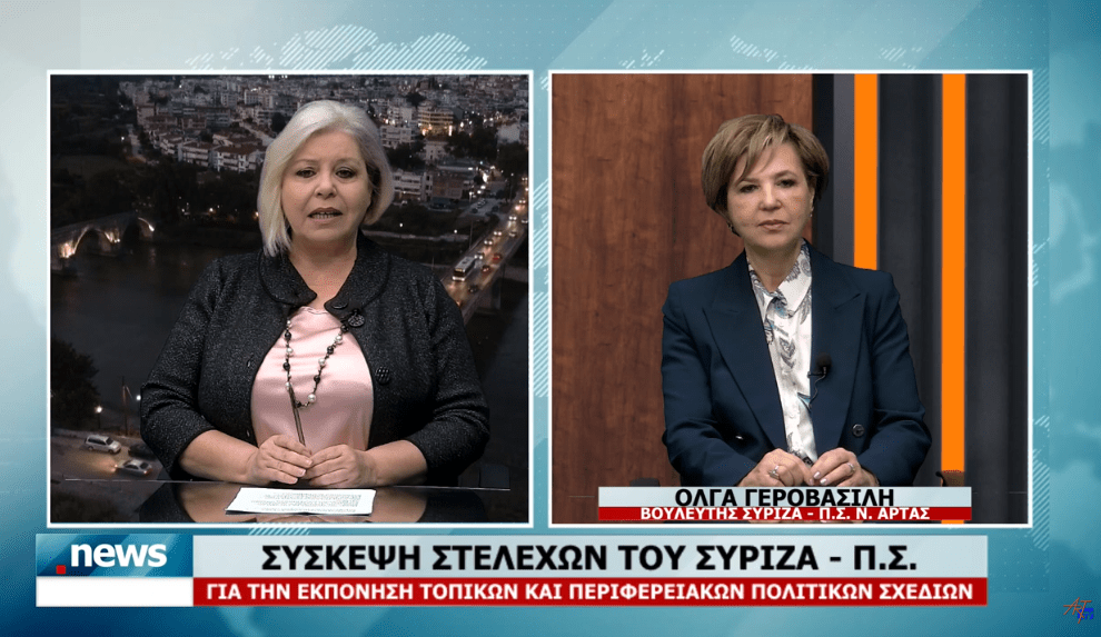 Για τις πολιτικές εξελίξεις στη χώρα και τα κρίσιμα τοπικά ζητήματα της Άρτας και της Ηπείρου μίλησε χθες το βράδυ στο κεντρικό δελτίο ειδήσεων του Art TV Άρτας, με τη δημοσιογράφο Βίκυ Ευαγγελίου, η Αντιπρόεδρος της Βουλής και βουλευτής Άρτας του ΣΥΡΙΖΑ – Προοδευτική Συμμαχία, Όλγα Γεροβασίλη.