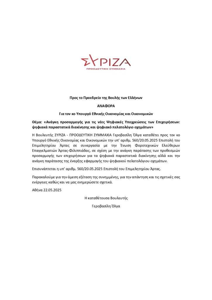 Η Βουλευτής Άρτας του ΣΥΡΙΖΑ – ΠΡΟΟΔΕΥΤΙΚΗ ΣΥΜΜΑΧΙΑ Γεροβασίλη Όλγα κατέθεσε ως αναφορά προς τον Υπουργό Εθνικής Οικονομίας και Οικονομικών την υπ’ αριθμ. 560/20.05.2025 Επιστολή του Επιμελητηρίου Άρτας σε συνεργασία με την Ένωση Φοροτεχνικών Ελεύθερων Επαγγελματιών Άρτας-Φιλιππιάδας, σε σχέση με την ανάγκη παράτασης των προθεσμιών προσαρμογής των επιχειρήσεων για τα ψηφιακά παραστατικά διακίνησης αλλά και την ανάγκη παράτασης της έναρξης εφαρμογής του ψηφιακού πελατολογίου οχημάτων.
