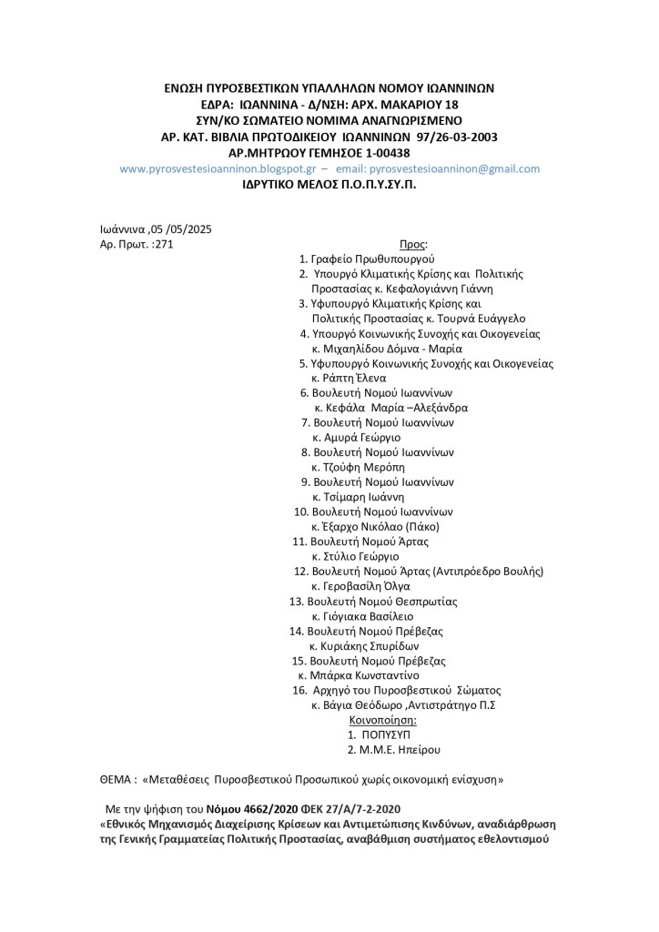 Επισυνάπτεται η αναφορά και η υπ’ αριθμ. 271/05.05.2025 Επιστολή της Ένωσης Πυροσβεστικών Υπαλλήλων Νομού Ιωαννίνων.