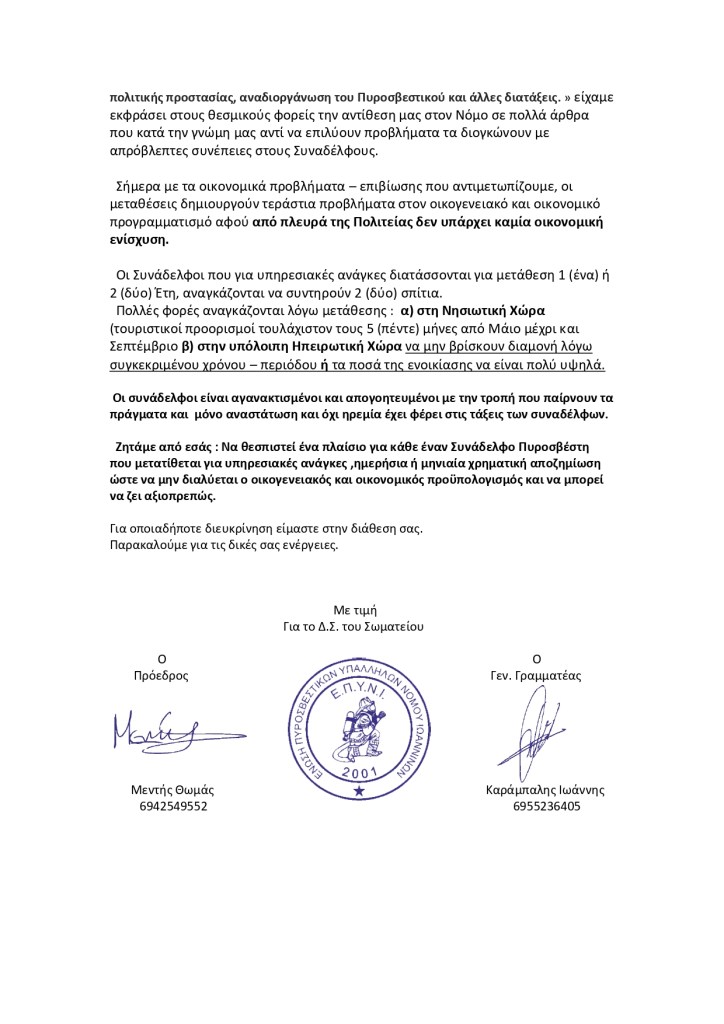 Με την επιστολή τίθεται το ζήτημα των τεράστιων οικονομικών προβλημάτων που αντιμετωπίζουν οι πυροσβέστες, οι οποίοι καλούνται σε περίπτωση μετάθεσής τους για υπηρεσιακές ανάγκες να συντηρούν δύο σπίτια χωρίς καμία οικονομική ενίσχυση από την Υπηρεσία, τινάζοντας στον αέρα τον οικονομικό και οικογενειακό τους προγραμματισμό.