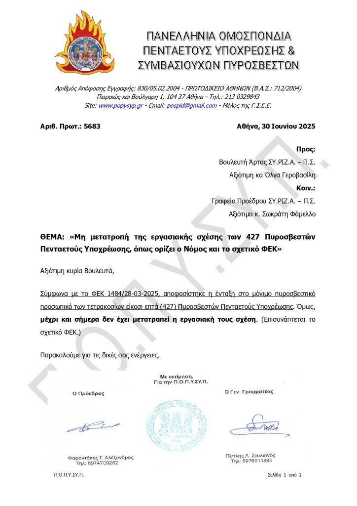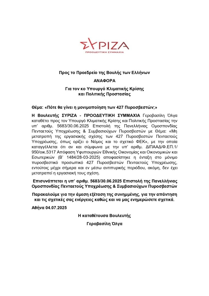 Η Βουλευτής ΣΥΡΙΖΑ – ΠΡΟΟΔΕΥΤΙΚΗ ΣΥΜΜΑΧΙΑ Γεροβασίλη Όλγα κατέθεσε ως αναφορά προς τον Υπουργό Κλιματικής Κρίσης και Πολιτικής Προστασίας την υπ’ αριθμ. 5683/30.06.2025 Επιστολή της Πανελλήνιας Ομοσπονδίας Πενταετούς Υποχρέωσης & Συμβασιούχων Πυροσβεστών με Θέμα: «Μη μετατροπή της εργασιακής σχέσης των 427 Πυροσβεστών Πενταετούς Υποχρέωσης, όπως ορίζει ο Νόμος και το σχετικό ΦΕΚ».