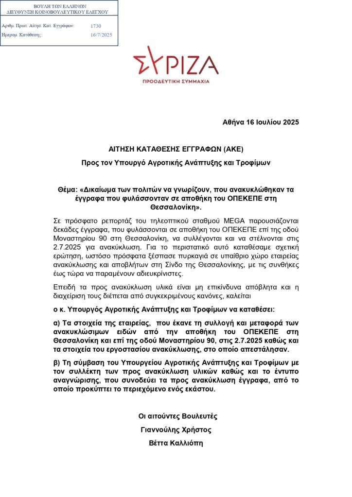 Αίτηση κατάθεσης εγγράφων (ΑΚΕ) προς τον Υπουργό Αγροτικής Ανάπτυξης και Τροφίμων με θέμα: «Δικαίωμα των πολιτών να γνωρίζουν, που ανακυκλώθηκαν τα έγγραφα που φυλάσσονταν σε αποθήκη του ΟΠΕΚΕΠΕ στη Θεσσαλονίκη» κατέθεσαν βουλευτες του ΣΥΡΙΖΑ-Π.Σ. μεταξύ των οποίων και η βουλευτής Άρτας Όλγα Γεροβασίλη