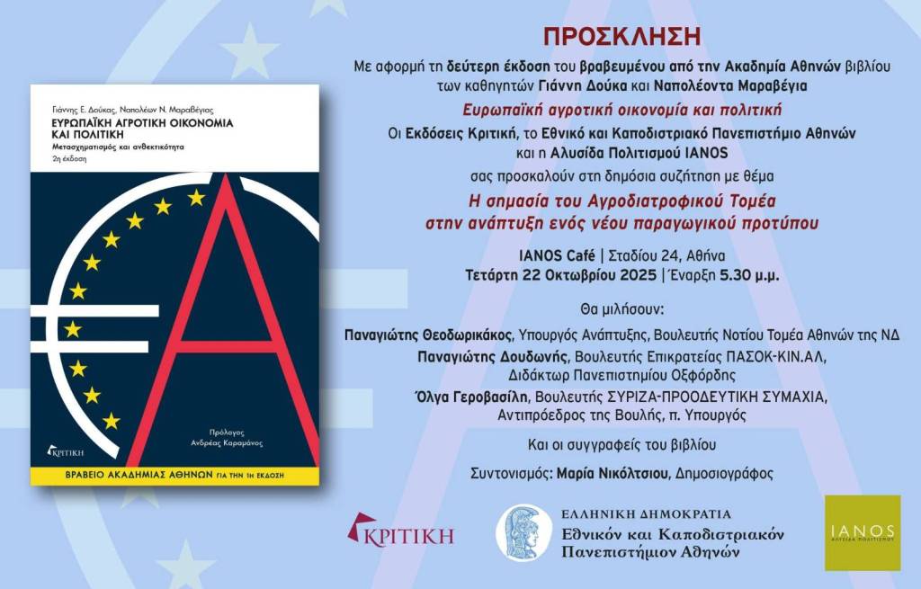 Σημεία από την τοποθέτησή κατά τη χθεσινή δημόσια συζήτηση με θέμα: «Η σημασία του Αγροδιατροφικού Τομέα στην ανάπτυξη ενός νέου παραγωγικού προτύπου», με αφορμή τη δεύτερη έκδοση του βιβλίου των καθηγητών Γιάννη Δούκα και Ναπολέοντα Μαραβέγια με τίτλο: «Ευρωπαϊκή αγροτική οικονομία και πολιτική»