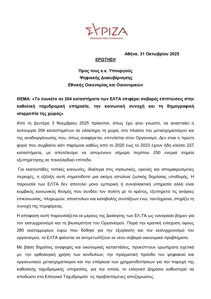 Την ώρα που οι πολίτες σε ολόκληρη τη χώρα, και ιδιαίτερα στις νησιωτικές, ορεινές και απομακρυσμένες περιοχές, βιώνουν τη συρρίκνωση κάθε δημόσιας υπηρεσίας, από τη Δευτέρα 3 Νοεμβρίου 2025 μπαίνει οριστικό «λουκέτο» σε 204 καταστήματα των Ελληνικών Ταχυδρομείων (ΕΛΤΑ).