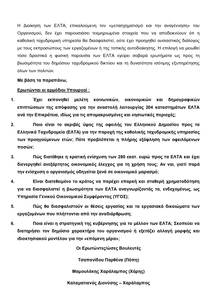 Η επιλογή της κυβέρνησης να αφήσει τον ιστορικό δημόσιο ταχυδρομικό φορέα να συρρικνωθεί και να αποδυναμωθεί εντάσσεται σε μια συνολικότερη στρατηγική ιδιωτικοποίησης των δημοσίων υπηρεσιών, που υπονομεύει την κοινωνική συνοχή και βαθαίνει τις ανισότητες ανάμεσα σε κέντρο και περιφέρεια.