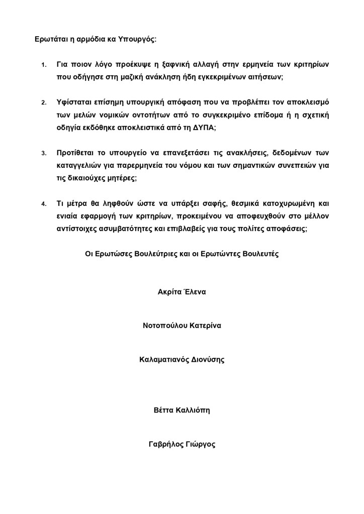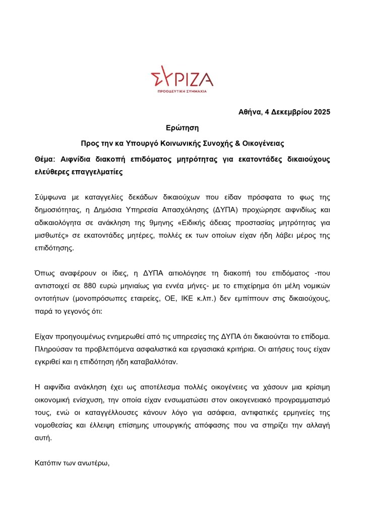 Οι βουλευτές του ΣΥΡΙΖΑ ζητούν σαφείς απαντήσεις σχετικά με το ποιος πήρε την απόφαση, με ποια εξουσιοδότηση και πώς σκοπεύει η κυβέρνηση να αποκαταστήσει μια κατάφωρη αδικία απέναντι σε μητέρες, που το μόνο «λάθος» τους ήταν ότι πίστεψαν την κυβέρνηση του Κ. Μητσοτάκη.