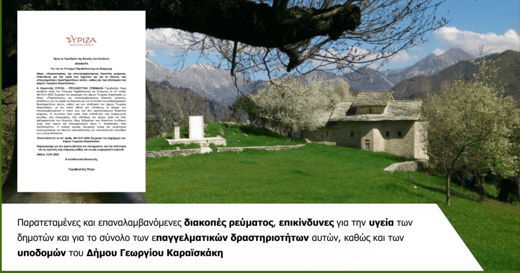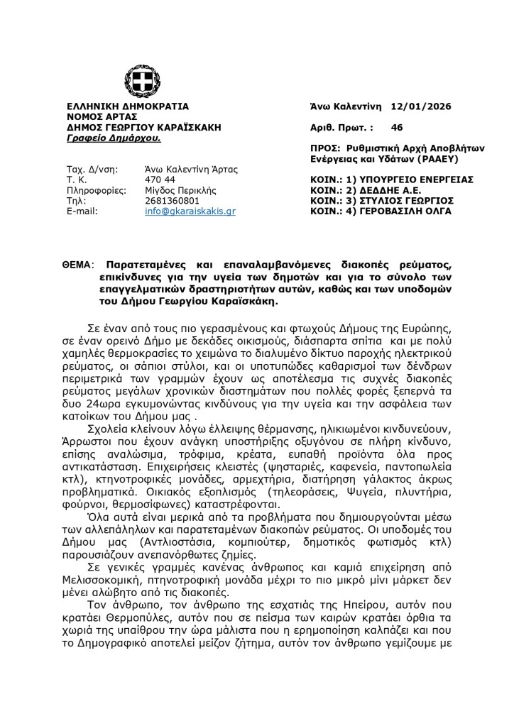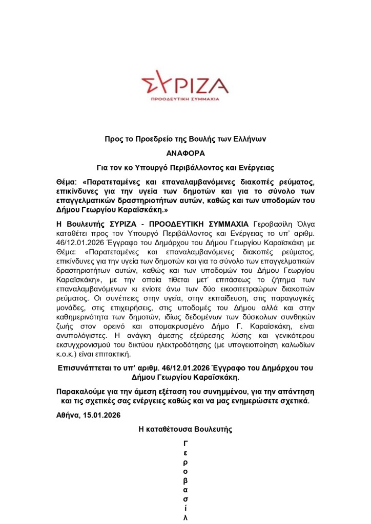 Η Βουλευτής Άρτας του ΣΥΡΙΖΑ – ΠΡΟΟΔΕΥΤΙΚΗ ΣΥΜΜΑΧΙΑ Όλγα Γεροβασίλη κατέθεσε ως αναφορά προς τον υπουργό Περιβάλλοντος και Ενέργειας το υπ’ αριθμ. 46/12.01.2026 έγγραφο του Δημάρχου του Δήμου Γεωργίου Καραϊσκάκη με Θέμα: «Παρατεταμένες και επαναλαμβανόμενες διακοπές ρεύματος, επικίνδυνες για την υγεία των δημοτών και για το σύνολο των επαγγελματικών δραστηριοτήτων αυτών, καθώς και των υποδομών του Δήμου Γεωργίου Καραϊσκάκη»,