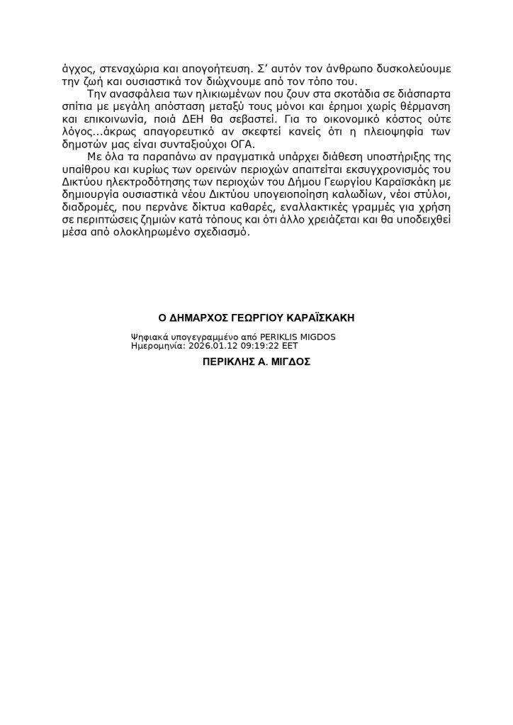 Με το έγγραφο αυτό τίθεται μετ’ επιτάσεως το ζήτημα των επαναλαμβανόμενων κι ενίοτε άνω των δύο εικοσιτετραώρων διακοπών ρεύματος. Οι συνέπειες στην υγεία, στην εκπαίδευση, στις παραγωγικές μονάδες, στις επιχειρήσεις, στις υποδομές του Δήμου αλλά και στην καθημερινότητα των δημοτών, ιδίως δεδομένων των δύσκολων συνθηκών ζωής στον ορεινό και απομακρυσμένο Δήμο Γ. Καραϊσκάκη, είναι ανυπολόγιστες.
