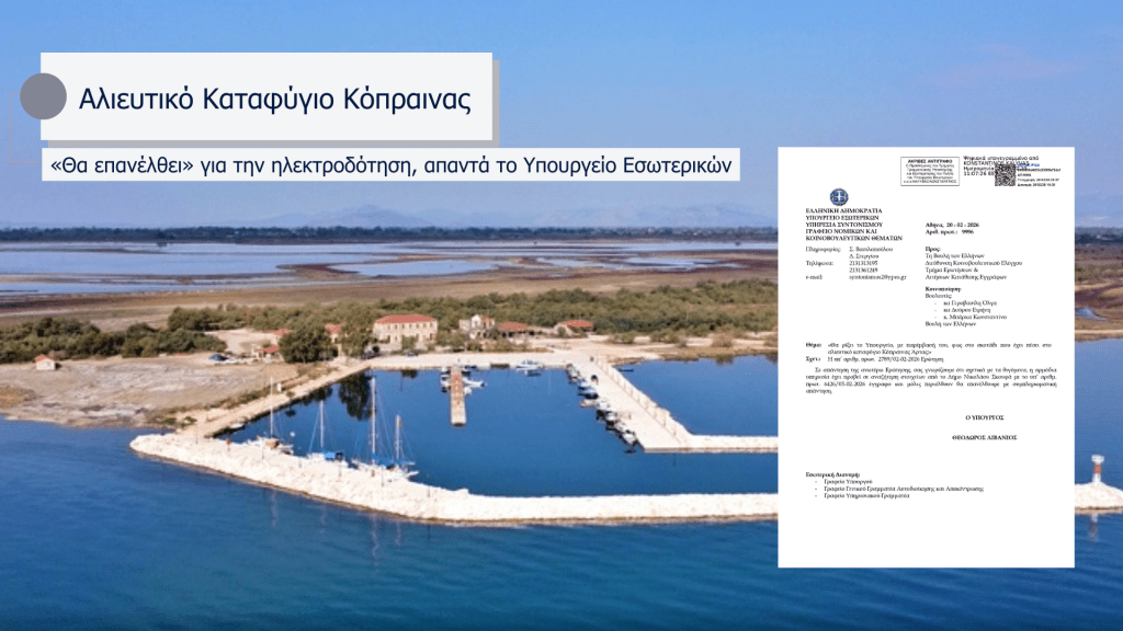 Στις 02.02.2026, η Βουλευτής Άρτας ΣΥΡΙΖΑ-ΠΣ, Όλγα Γεροβασίλη κατέθεσε κοινοβουλευτική ερώτηση προς τον Υπουργό Εσωτερικών, ρωτώντας αν σκοπεύει το Υπουργείο να ρίξει, με παρέμβασή του, φως στο σκοτάδι που έχει πέσει στο αλιευτικό καταφύγιο Κόπραινας Άρτας, αναλαμβάνοντας συγκεκριμένες ενέργειες για την αποκατάσταση της ηλεκτροδότησης.