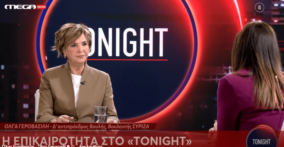 Η Αντιπρόεδρος της Βουλής και βουλευτής Άρτας του ΣΥΡΙΖΑ – Προοδευτική Συμμαχία, Όλγα Γεροβασίλη, παραχώρησε εκτενή συνέντευξη στον Τ/Σ MEGA NEWS και την εκπομπή «TONIGHT» με την δημοσιογράφο Βούλα Κεχαγια, τοποθετούμενη αναλυτικά για την υπόθεση των υποκλοπών, τις πολιτικές ευθύνες, την τραγωδία των Τεμπών, τη λειτουργία των θεσμών και τις πολιτικές εξελίξεις.