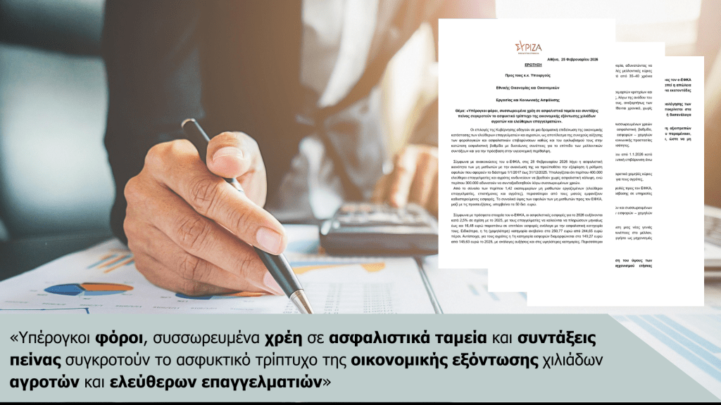Οι επιλογές της Κυβέρνησης οδηγούν σε μια δραματική επιδείνωση της οικονομικής κατάστασης των ελεύθερων επαγγελματιών και αγροτών, ως αποτέλεσμα της συνεχούς αύξησης των φορολογικών και ασφαλιστικών επιβαρύνσεων καθώς και του εγκλωβισμού τους στην κατώτατη ασφαλιστική βαθμίδα με δυσοίωνες συνέπειες για το επίπεδο των μελλοντικών συντάξεων και για την πρόσβαση στην υγειονομική περίθαλψη.
