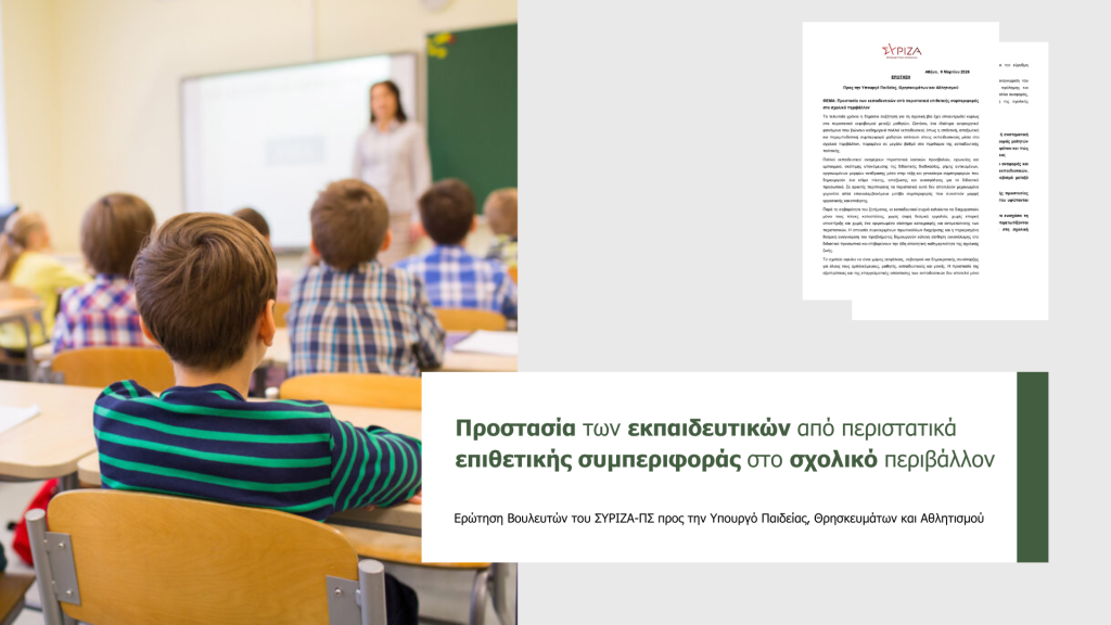 Ερώτηση προς την Υπουργό Παιδείας, Θρησκευμάτων και Αθλητισμού κατέθεσαν δεκαπέντε (15) βουλευτές του ΣΥΡΙΖΑ-ΠΣ, μεταξύ των οποίων και η βουλευτής Άρτας Όλγα Γεροβασίλη, αναδεικνύοντας την ανάγκη προστασίας των εκπαιδευτικών από περιστατικά επιθετικής και απαξιωτικής συμπεριφοράς στο σχολικό περιβάλλον.