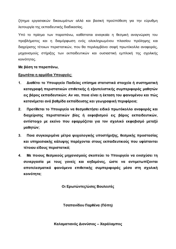 Οι Βουλευτές τονίζουν ότι οι εκπαιδευτικοί συχνά καλούνται να διαχειριστούν τέτοιες καταστάσεις χωρίς σαφή θεσμικά εργαλεία, χωρίς επαρκή υποστήριξη και χωρίς οργανωμένο σύστημα καταγραφής και αντιμετώπισης των περιστατικών. Υπογραμμίζουν ότι η προστασία της αξιοπρέπειας και της επαγγελματικής υπόστασης των εκπαιδευτικών αποτελεί βασική προϋπόθεση για την εύρυθμη λειτουργία της εκπαιδευτικής διαδικασίας και για τη διασφάλιση ενός σχολικού περιβάλλοντος ασφάλειας και σεβασμού.