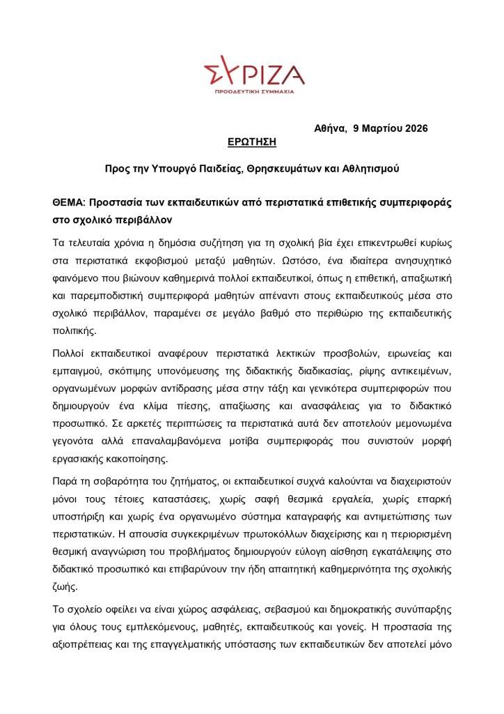 Όπως επισημαίνεται στην κοινοβουλευτική παρέμβαση, παρότι η δημόσια συζήτηση για τη σχολική βία επικεντρώνεται κυρίως στον εκφοβισμό μεταξύ μαθητών, ένα ιδιαίτερα ανησυχητικό φαινόμενο που βιώνουν πολλοί εκπαιδευτικοί – όπως λεκτικές προσβολές, ειρωνεία, εμπαιγμός, σκόπιμη υπονόμευση της διδακτικής διαδικασίας και άλλες συμπεριφορές πίεσης και απαξίωσης μέσα στην τάξη – παραμένει σε μεγάλο βαθμό εκτός του κέντρου της εκπαιδευτικής πολιτικής. Σε αρκετές περιπτώσεις, μάλιστα, τα περιστατικά αυτά εμφανίζονται επαναλαμβανόμενα, δημιουργώντας κλίμα ανασφάλειας και έντονης επαγγελματικής πίεσης για το διδακτικό προσωπικό.