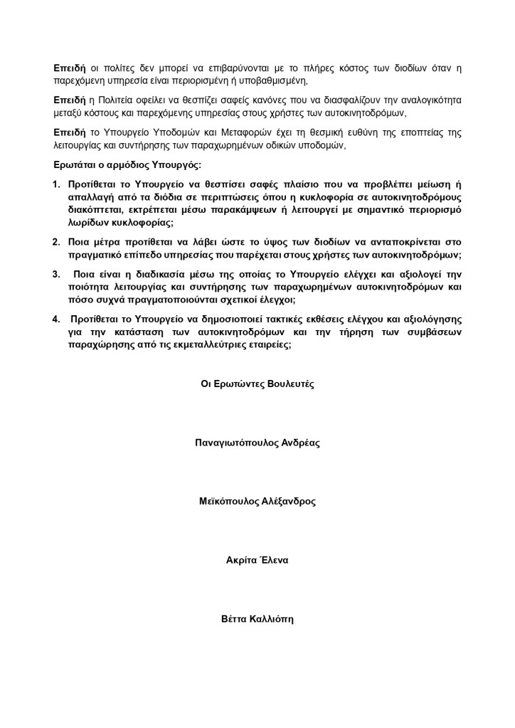 Το κράτος οφείλει να διασφαλίζει ότι το ύψος των διοδίων ανταποκρίνεται στο επίπεδο υπηρεσίας που πραγματικά παρέχεται στους χρήστες των αυτοκινητοδρόμων. Η απουσία ενός σαφούς και θεσμοθετημένου πλαισίου που να προβλέπει μείωση ή απαλλαγή από τα διόδια σε περιπτώσεις διακοπής κυκλοφορίας, εκτροπών ή σημαντικών περιορισμών της οδικής λειτουργίας δημιουργεί εύλογη δυσαρέσκεια στους πολίτες και ενισχύει την αίσθηση ότι προτεραιότητα αποτελεί η διασφάλιση των εσόδων των παραχωρησιούχων και όχι η προστασία των χρηστών των υποδομών.