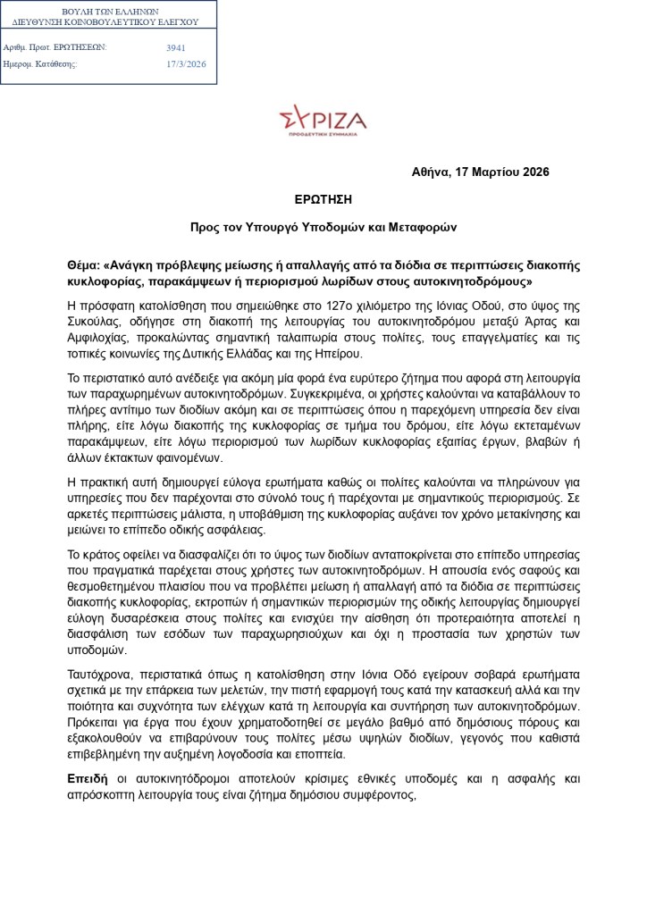 Ερώτηση βουλευτών του ΣΥΡΙΖΑ-ΠΣ, μεταξύ των οποίων και η βουλευτής Άρτας Όλγα Γεροβασίλη, προς τον υπουργό Υποδομών και Μεταφορών με πρωτοβουλία του βουλευτή Αχαΐας Ανδρέα Παναγιωτόπουλου