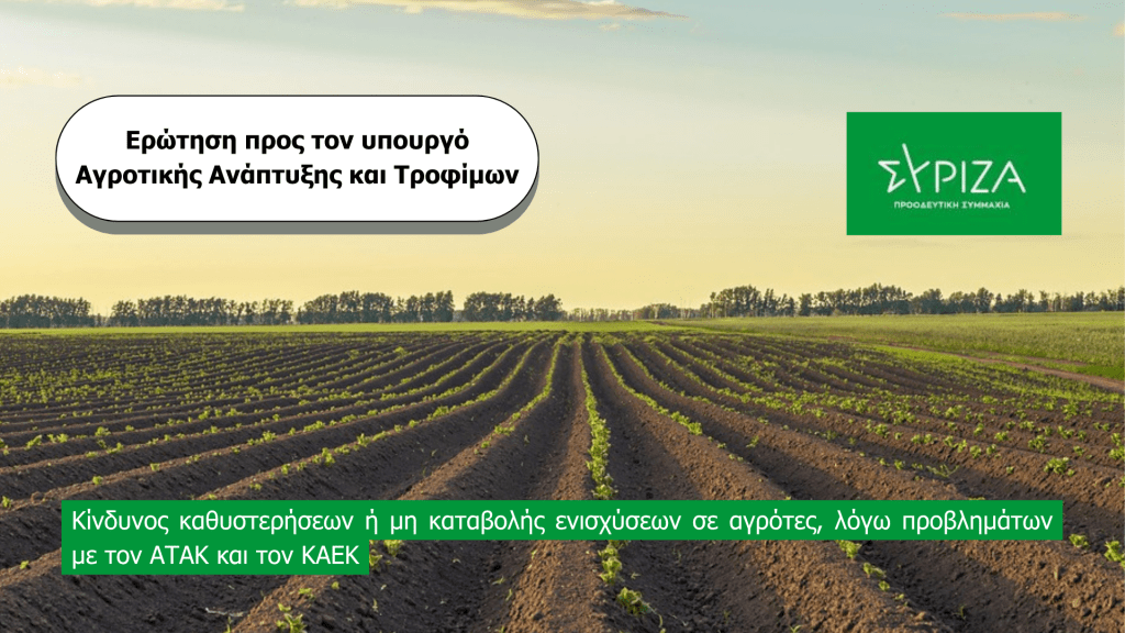 Ερώτηση βουλευτών του ΣΥΡΙΖΑ-ΠΣ, μεταξύ των οποίων και η βουλευτής Άρτας Όλγα Γεροβασίλη, προς τον υπουργό Αγροτικής Ανάπτυξης και Τροφίμων με θέμα: «Κίνδυνος καθυστερήσεων ή μη καταβολής ενισχύσεων σε αγρότες, λόγω προβλημάτων με τον ΑΤΑΚ και τον ΚΑΕΚ» με πρωτοβουλία του Β. Κόκκαλη
