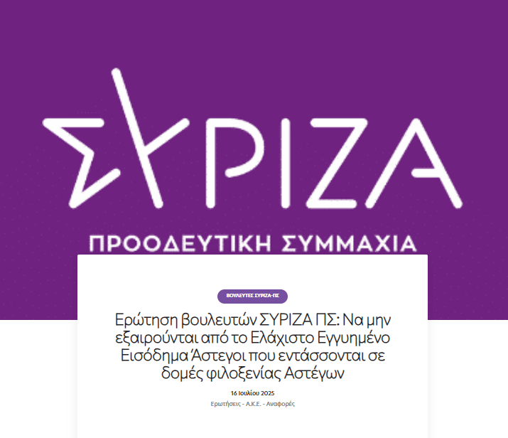 Ερώτηση προς την Υπουργό Κοινωνικής Συνοχής και Οικογένειας με θέμα : «Να μην εξαιρούνται από το Ελάχιστο Εγγυημένο Εισόδημα Άστεγοι που εντάσσονται σε δομές φιλοξενίας Αστέγων» κατέθεσαν βουλευτές του ΣΥΡΙΖΑ-Π.Σ., μεταξύ των οποίων και η βουλευτής Άρτας Όλγα Γεροβασίλη.