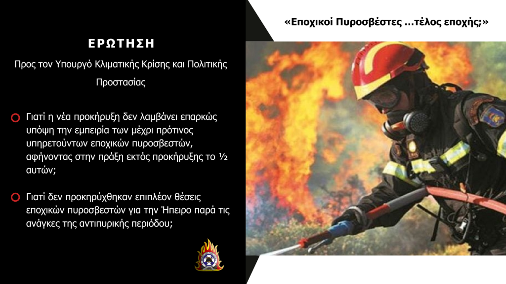 Ερώτηση προς τον Υπουργό Κλιματικής Κρίσης και Πολιτικής Προστασίας με θέμα: «Εποχικοί Πυροσβέστες …τέλος εποχής;» κατέθεσε η βουλευτής Άρτας του ΣΥΡΙΖΑ-ΠΣ και Δ’ αντιπρόεδρος της βουλής ‘Ολγα Γεροβασίλη. Την ερώτηση συνυπογράφουν ο αρμόδιος Τομεάρχης της Κ.Ο. του ΣΥΡΙΖΑ-ΠΣ Ψυχογιός Γιώργος και ο βουλευτής Πρέβεζας Μπάρκας Κώστας