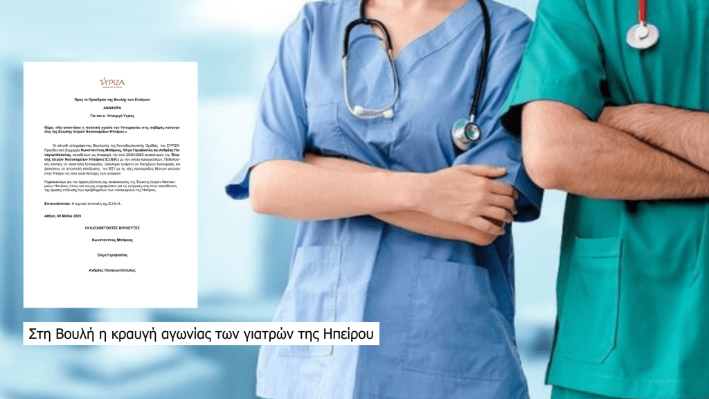 Με αναφορά προς τον Υπουργό Υγείας, οι βουλευτές του ΣΥΡΙΖΑ – Προοδευτική Συμμαχία Κώστας Μπάρκας και Όλγα Γεροβασίλη, με τη συνυπογραφή του Ανδρέα Παναγιωτόπουλου, φέρνουν στη Βουλή την ανακοίνωση της Ένωσης Ιατρών Νοσοκομείων Ηπείρου (ΕΙΝΗ) για την υποστελέχωση των νοσοκομείων της περιοχής και τον άμεσο κίνδυνο για τη δημόσια υγεία