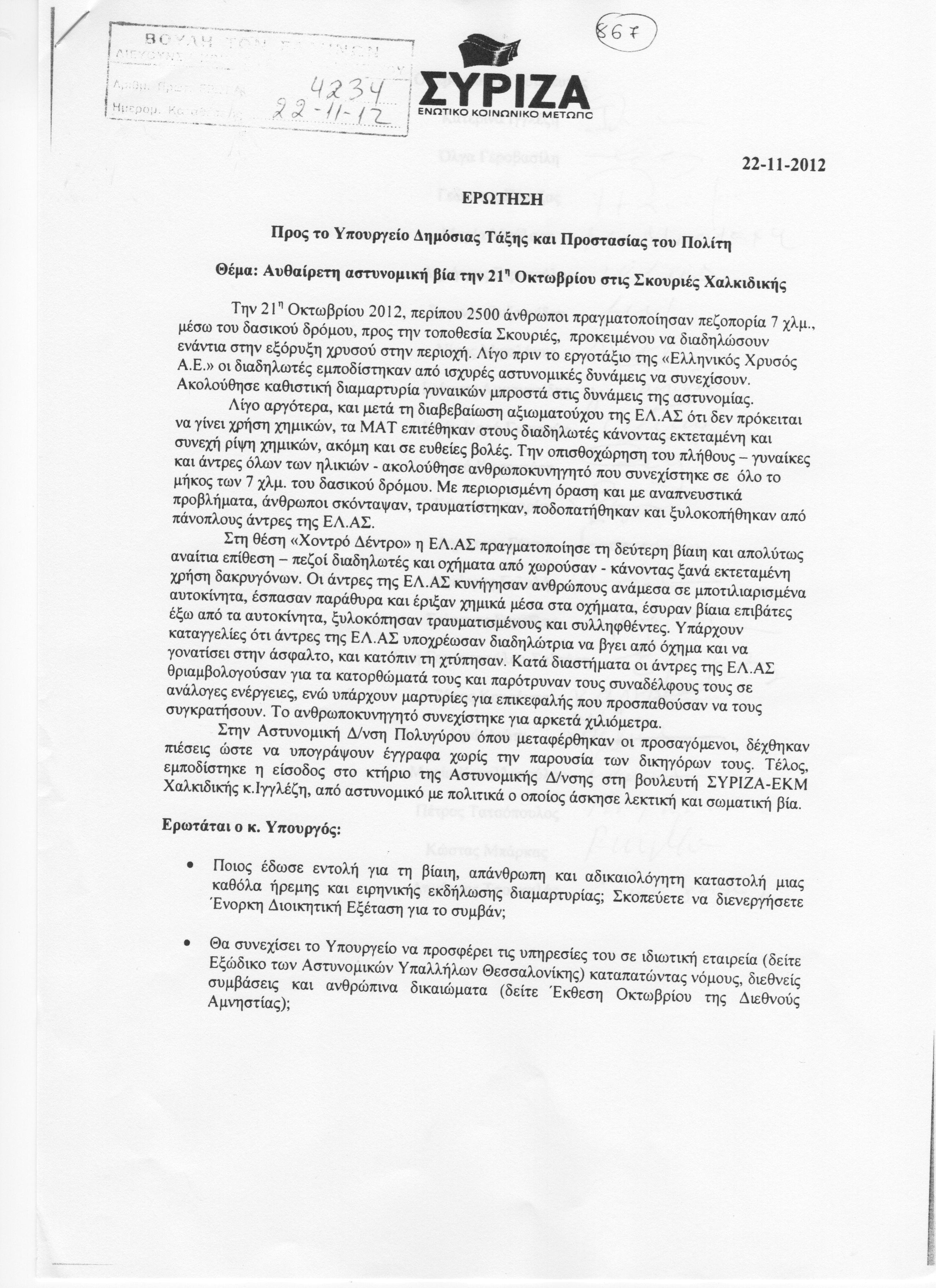 Δείτε την ερώτηση για Αυθαίρετη αστυνομική βία στις Σκουριές.