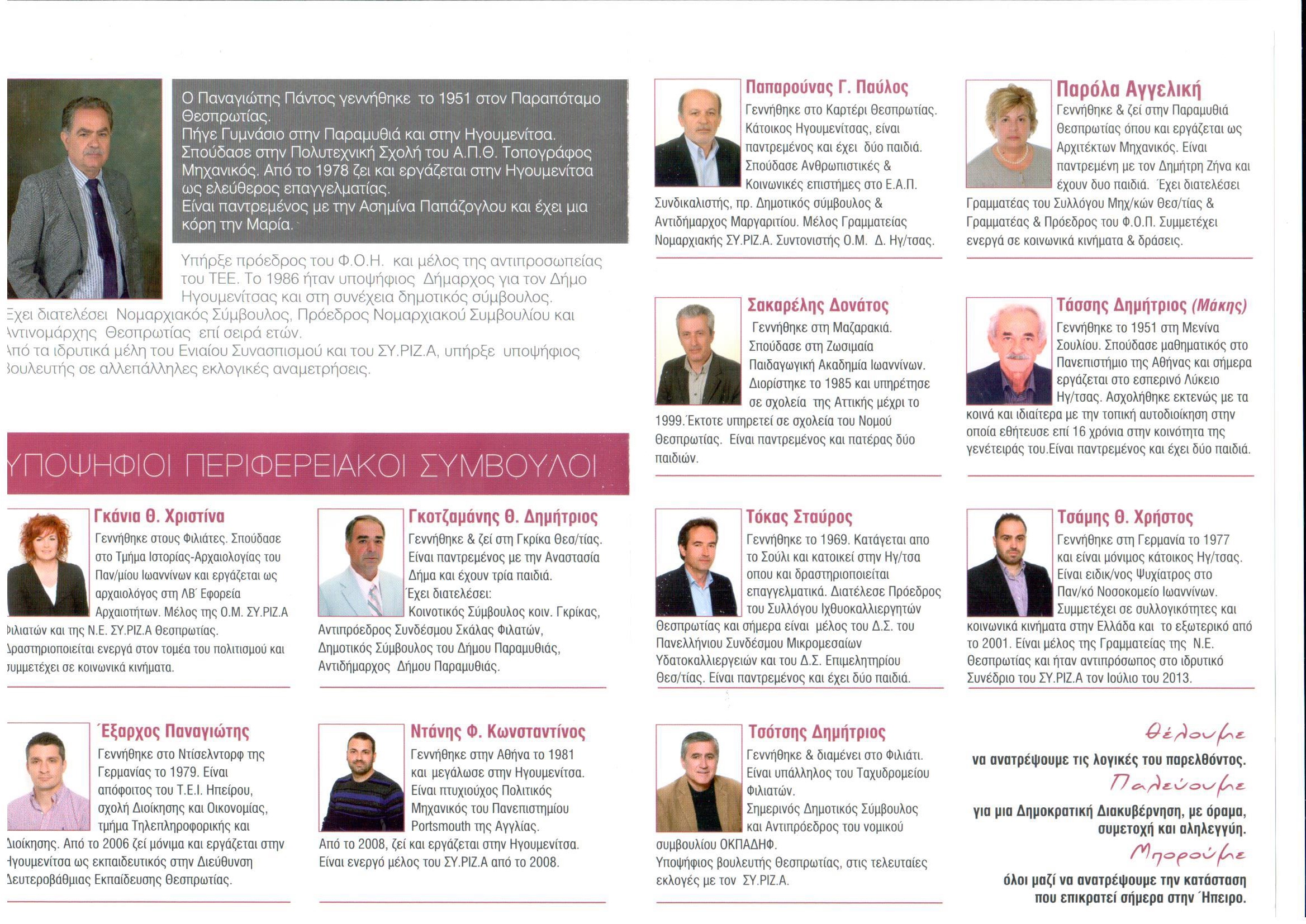 Ο υποψήφιος Αντιπεριφερειάρχης Π.Ε. Θεσπρωτίας Παναγιώτης Πάντος και υποψήφιοι περιφερειακοί σύμβουλοι με την παράταξη «Ήπειρος Ανατροπής» της Όλγας Γεροβασίλη επισκέφτηκαν το πρωί της Πέμπτης 8/5 τους Φιλιάτες, το πρωί του Σαββάτου 10/5 την Παραμυθιά και την Κυριακή 11/5 την ορεινή περιοχή του Δ. Φιλατών (Μαυρονέρι, Αγ. Νικόλαo, Αγ. Πάντες, Πλάτανο, Πόβλα, Τσαμαντά, Λιά, Βαβούρι, Λίστα, Καλλιθέα, Ραβενή και Λεπτοκαριά).