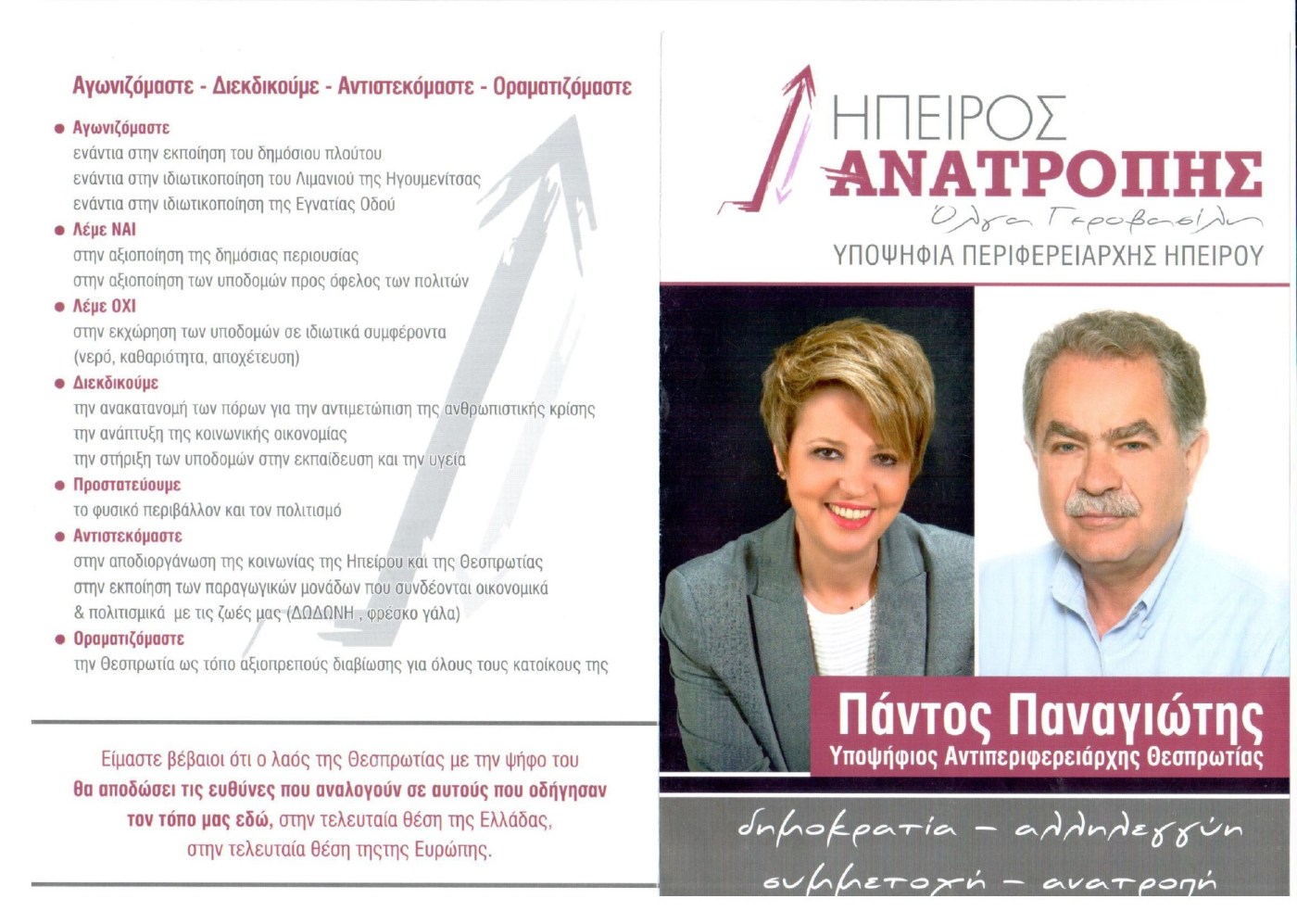 Υποψήφιος αντιπεριφερειάρχης Π.Ε. Θεσπρωτίας είναι ο Παναγιώτης Πάντος, τοπογράφος και υποψήφιοι περιφερειακοί σύμβουλοι οι Γκάνια Χριστίνα, αρχαιολόγος, Μποροδήμος Αθανάσιος, ορθοπεδικός, Ντάνης Κωνσταντίνος, πολιτικός μηχανικός, Παπαρούνας Παύλος, ταχυδρομικός, Παρόλα Αγγελική, αρχιτέκτων Μηχανικός, Τάσσης Δημήτριος, εκπαιδευτικός, Τόκας Σταύρος, επιχειρηματίας, Τσάμης Χρήστος, ψυχίατρος και Τσότσης Δημήτριος, ταχυδρομικός.