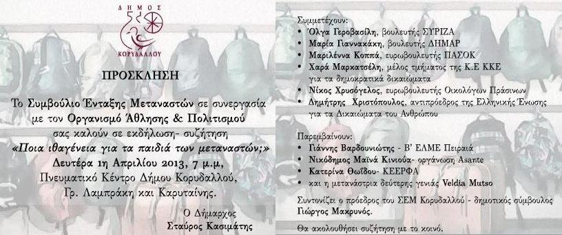 Το Συμβούλιο Ένταξης Μεταναστών σε συνεργασία με τον Οργανισμό Άθλησης & Πολιτισμού του Δήμου Κορυδαλλού διοργάνωσε εκδήλωση- συζήτηση με θέμα «Ποια ιθαγένεια για τα παιδιά των μεταναστών;» την Δευτέρα 1η Απριλίου 2013 στις 7 μ.μ, Πνευματικό Κέντρο Δήμου Κορυδαλλού.
