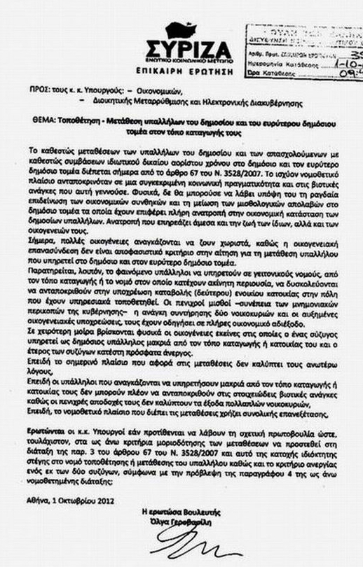 Η βουλευτής Άρτας του ΣΥΡΙΖΑ-ΕΚΜ με την επίκαιρη ερώτησή που κατέθεσε, πρότεινε τη διεύρυνση των κριτηρίων που αφορούν στις μεταθέσεις των δημοσίων υπαλλήλων, ώστε να διευκολύνονται υπάλληλοι με άνεργο/η σύζυγο ή ιδιόκτητη στέγη να τοποθετούνται στον τόπο καταγωγής τους.