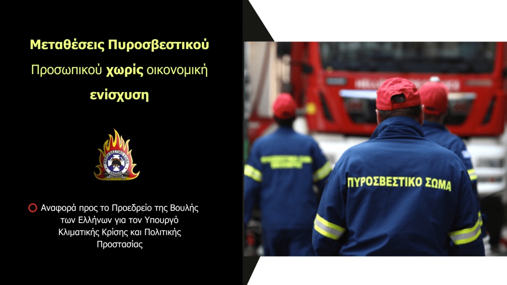 Αναφορά προς το Προεδρείο της Βουλής των Ελλήνων για τον Υπουργό Κλιματικής Κρίσης και Πολιτικής Προστασίας με θέμα: «Μεταθέσεις Πυροσβεστικού Προσωπικού χωρίς οικονομική ενίσχυση»