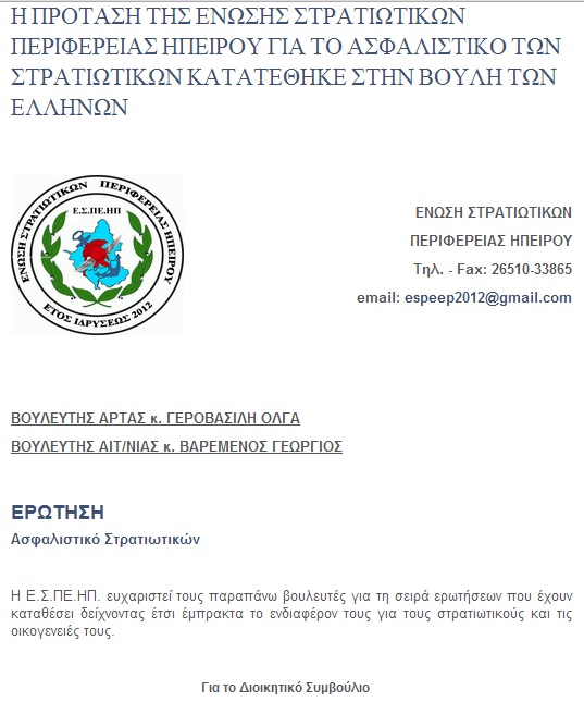 Ερώτηση κατέθεσαν στις 7-5-2014 οι βουλευτές τιυ ΣΥΡΙΖΑ Όλγα Γεροβασίλη και Γιώργος Βαρεμένος για ασφαλιστικά θέματα των στρατιωτικών. Συγκεκριμένα ερωτήθηκαν οι υπουργοί: Συνέχεια ανάγνωσης «Ευχαριστήριο της ΕΣΠΕΗΠ»