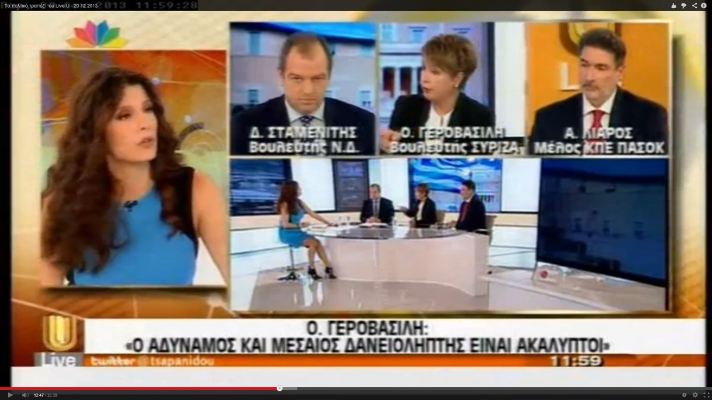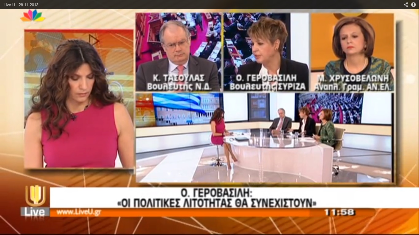 Στην εκπομπή “Live-U” με την Πόπη Τσαπανίδου, Πέμπτη 28-11-2013 στις 11:50 π.μ. (μετά το σημείο 1:36:40).